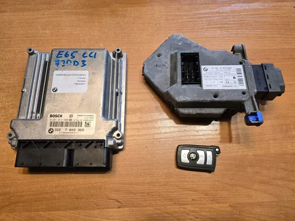Kit de démarrage disponible pour BMW 7 E65 3.0D, comprenant le contrôleur moteur numéro 7803369, le contacteur d'allumage numéro 6972688 et la télécommande comme montré sur la photo. Cet ensemble provient d'une version facelift de 2006 avec moteur M57 de 231 ch. Tous les composants sont en bon état et entièrement fonctionnels.