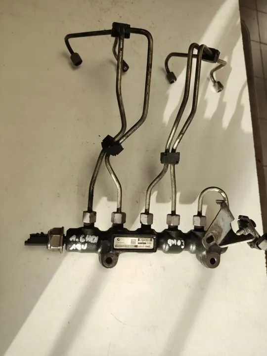 Rampe de carburant avec capteur pour Peugeot Citroen 1.6 HDI 16V, numéro de pièce 1570G2. Cette rampe de carburant provient du dernier moteur 1.6 HDI 16V avec désignation 9H03. Le numéro de pièce pour la rampe est 1570G2, et le numéro du capteur est 9650227880. L'ensemble comprend des tuyaux pour injecteurs avec numéros d'origine 1i2 1570G43, 3i4 1570G5, et rampe-pompe 1570H5. L'état est bon.
