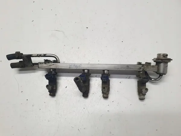 Rampe de carburant utilisée pour moteur essence VW T5 2.0. Numéro de pièce 06A906031AC. Les images incluses montrent l'état réel de la pièce.